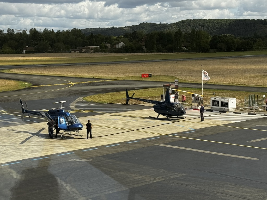 Two helicopters parked on an airfield with people nearby, highlighting Helipaddy landing locations.