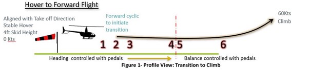 | 1 | The pilot applies forward cycle to initiate transition to forward flight. Loss of Height as rotor disc is tilted, and total rotor thrust is angled away from the vertical, with a forward component of thrust causing helicopter acceleration | Raise Collective to increase total rotor thrust to compensate |