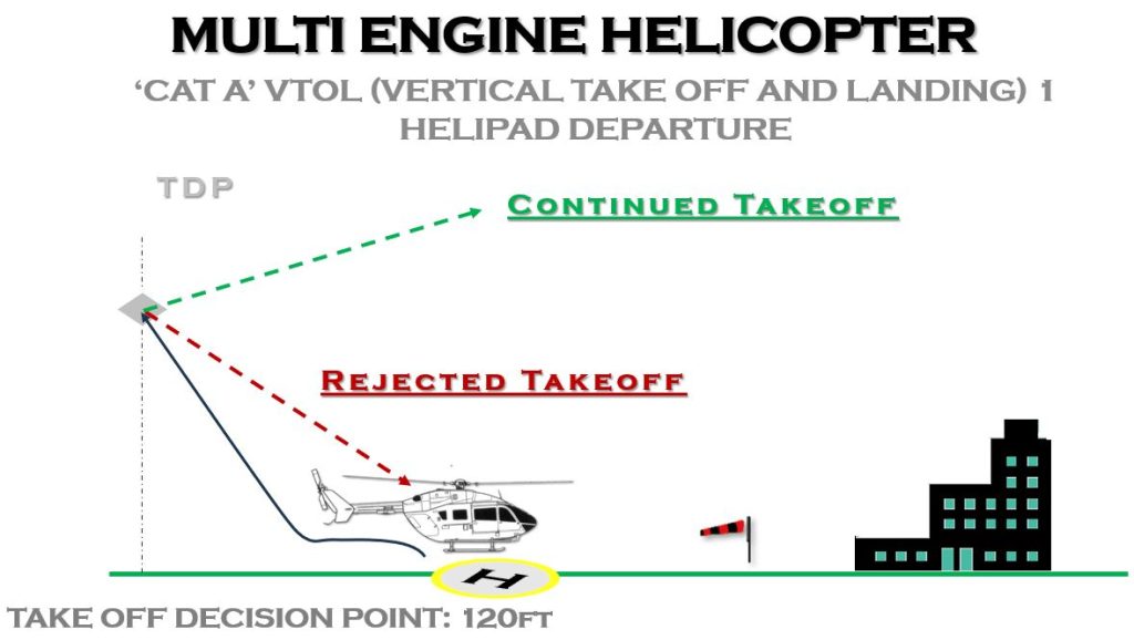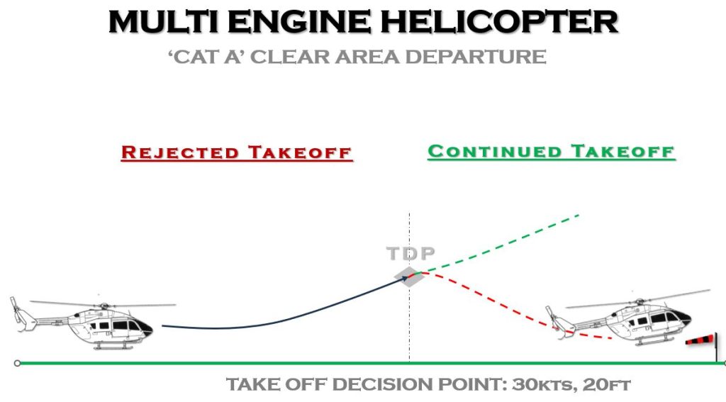 For a multi-engine helicopter, the take-off profiles are similar, but there are is the inclusion of a key point during the process, where a decision is made to either continue to take off or to abort if there was an emergency. in a helicopter it’s known as the ‘take-off decision point’, TDP and its similar to the ‘v-1’ speed and a fixed-wing aircraft.
