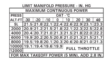 So, as an example, say that pressure altitude is around 2000ft, with an OAT of 20 degrees. The maximum take-off power for the day is 22.3 + 2.8= 25.1, well short of the red line at 26.1.
