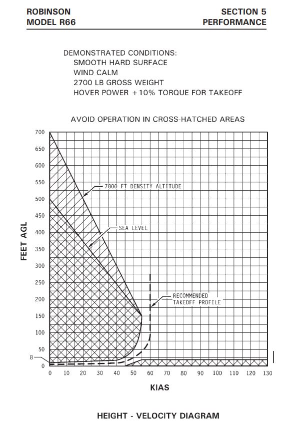 Below is the height velocity diagram for the Robinson r 66 turbine, single engine helicopter, and shows the recommended take-off profile, used in a clear area. All H/V diagrams include a recommended take-off profile, which must exceed the HV curve by at least 5 knots.