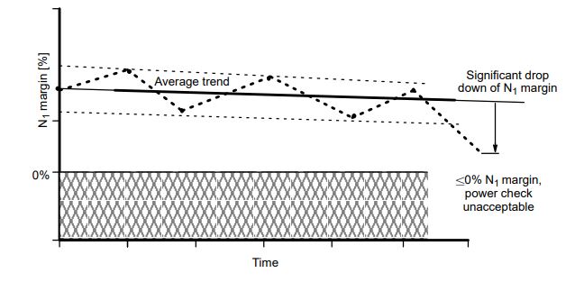 The below is an example of the graphic plot of the engine performance and the acceptable margins, used to detect when an engine starts to underperform.