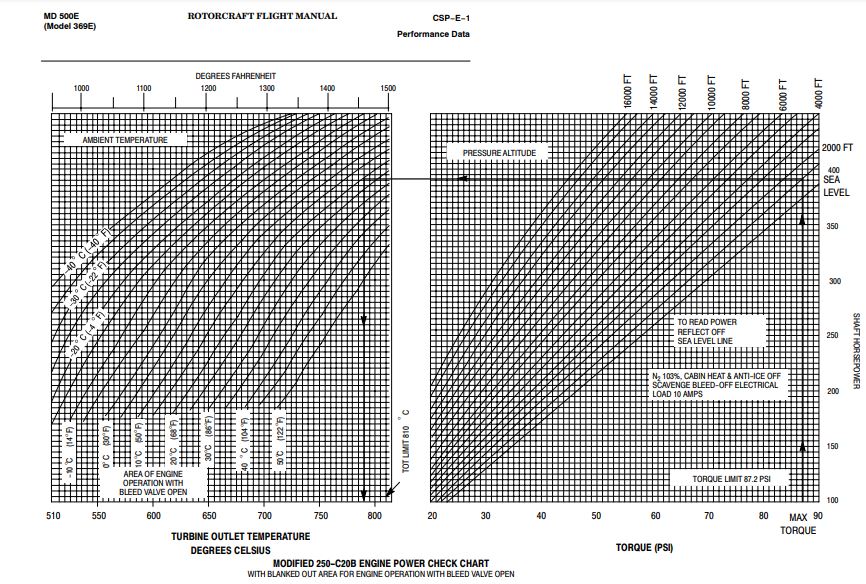 On the MD500, for example, the following graph is provided to confirm the engine is providing the power that it ‘should’. In straight and level flight, you record the parameters of the engine RPM, turbine outlet temperature, and the atmospheric conditions of temperature and pressure. This then gets plotted to see if ‘your’ engine is running too hot for the given torque setting, which, if the case, indicates that you may not meet the performance criteria shown in the flight manual.